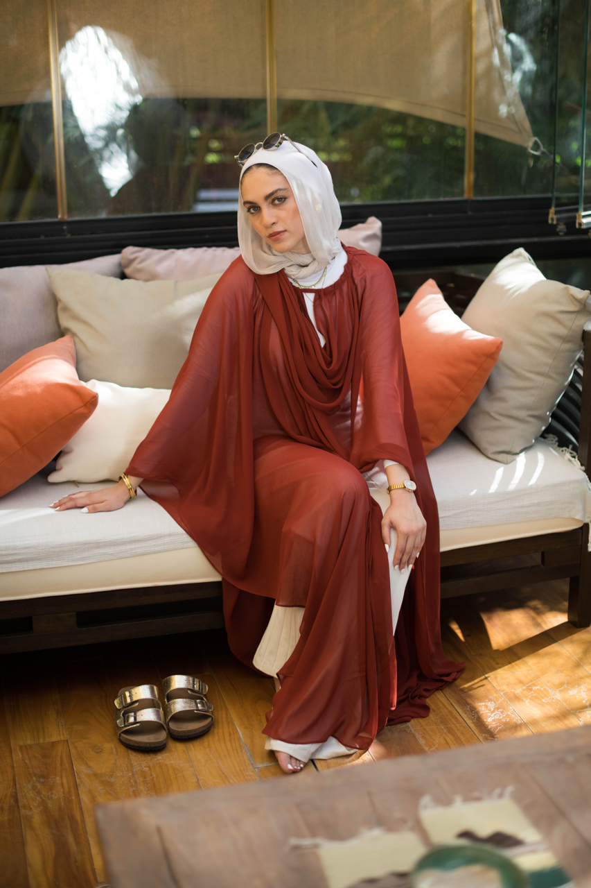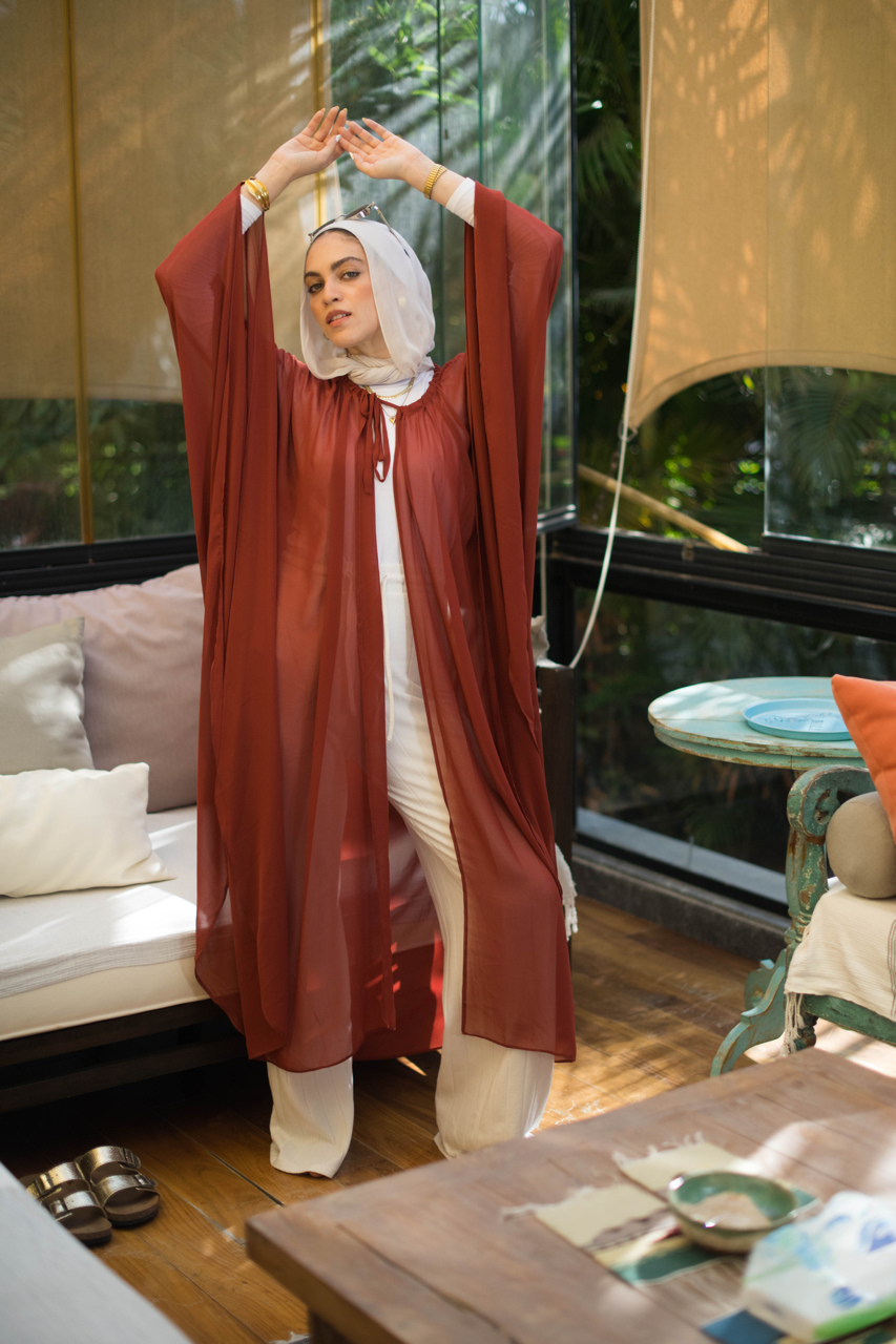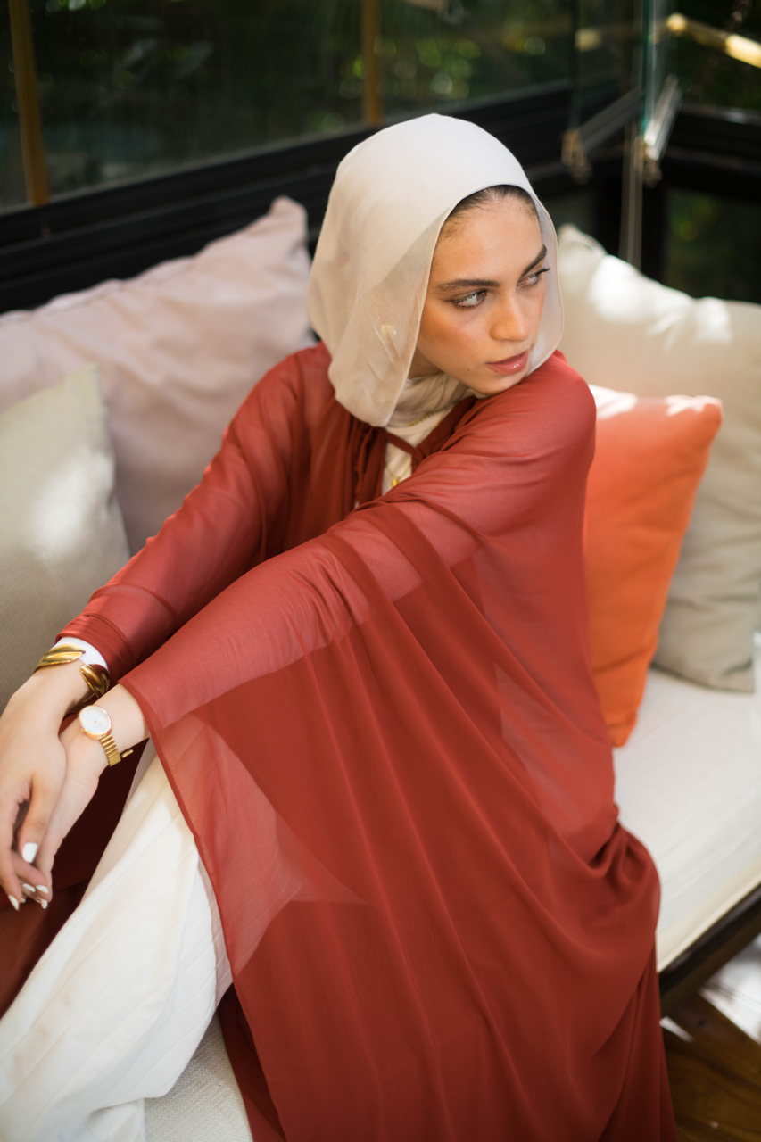 This versatile sheer chiffon cape can be styled in various ways, providing endless options for fashionable looks. With its one-size-fits-all design and striking orangey marroon shade, it's the perfect addition to any wardrobe. Experience the luxurious feel of chiffon while elevating your style game.